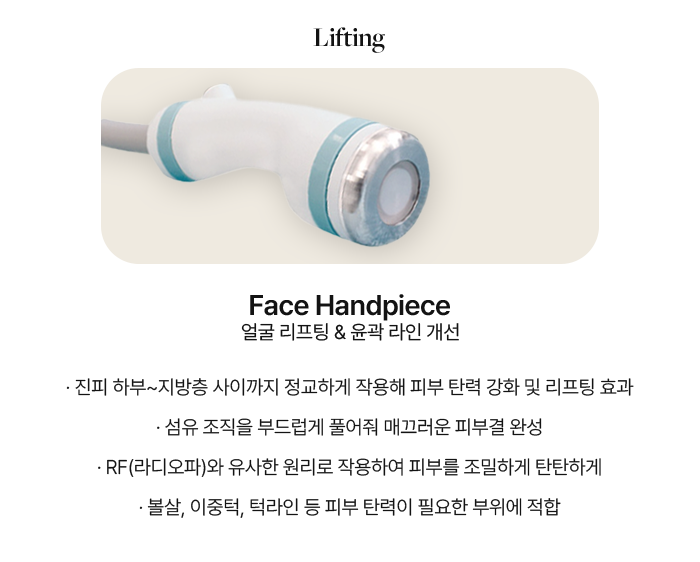 스킨 타이트닝과 컨투어링에 효과적입니다. 피부 표면을 보호하고 에너지 손실을 막아 확실한 리프팅 효과와 피부 타이트닝 효과를 선사해 드립니다.