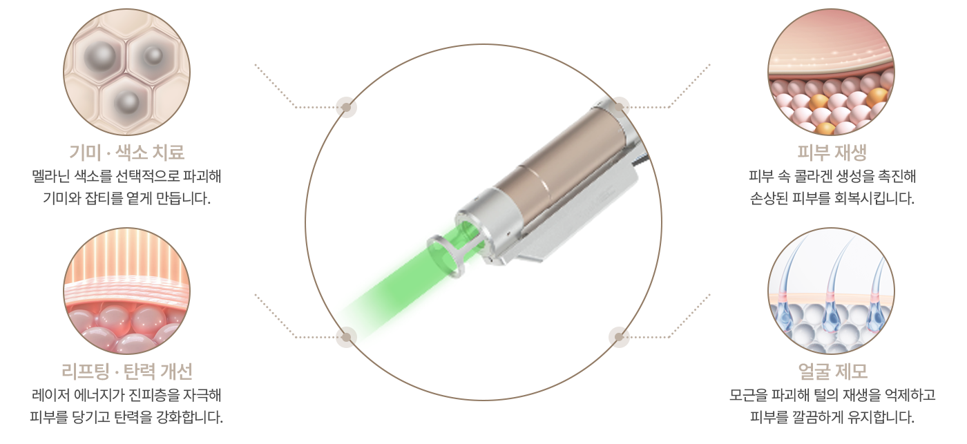 멜라닌 색소를 선택적으로 파괴해 기미와 잡티를 옅게 만듭니다. |